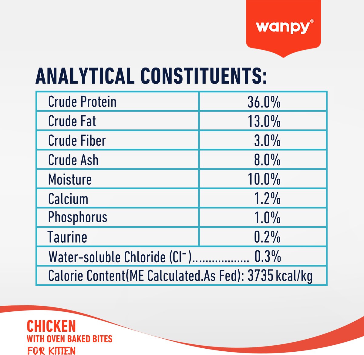 Toevoegingmiddelen: Taurine, vitamine A-acetaat, vitamines (B1, B2, B6, B12, D3), DL-α-tocoferylacetaat (vitamine E), vitamine C, menadion nicotinamide bisulfiet, D-biotine, niacinamide, D-calcium pantothenaat, foliumzuur, zinksulfaat, kopersulfaat, ijzersulfaat, mangaantlysinesulfaat, calciumjodaat, natriumseleniet, gehydrolyseerd visextract, gehydrolyseerd kippenmeel, antioxidanten, cholinechloride, probiotica (Lactobacillus acidophilus, geïnactiveerd 18,0 × 10⁹ CFU/kg – bron van ovengebakken bites).